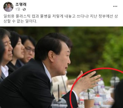 지난 3일 조명래 전 장관은 본인의 페이스북에 "일회용 플라스틱 컵과 물병을 저렇게 내놓고 쓰다니! 지난 정부에선 상상할 수 없는 일이다"라며 윤 대통령의 사진을 게시했다.