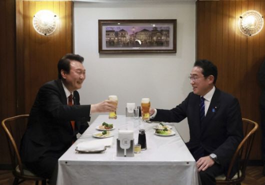 윤석열(왼쪽) 대통령과 기시다 후미오 일본 총리가 3월 16일 맥주로 건배하고 있다. 도쿄/AP뉴시스 |