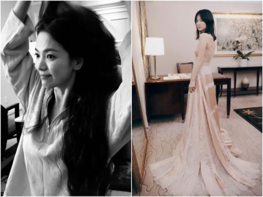 이날 송혜교는 전에 본 적 없는 히메컷과 우아함과 섹시한 매력이 겸비된 누드톤 드레스를 선보였다.