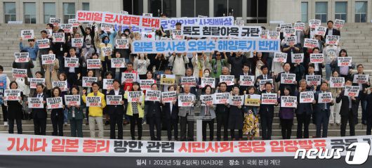 (서울=뉴스1) 송원영 기자 = 4일 오전 서울 여의도 국회 본청 앞 계단에서 더불어민주당, 정의당, 진보당 주최로 '기시다 일본 총리 방한 관련 시민사회 및 정당 입장발표 공동 기자회견'이 열리고 있다. 이날 기자회견에서 참석자들은 일본 식민지배 역사왜곡과 독도 영유권 주장을 중단 및 일제 강제동원과 일본군성노예제 사죄배상을 촉구했다. 또 참석자들은 일본 후쿠시마 방사성 오염수 해양투기 반대와 일본의 재무장 중단을 촉구했다. 2023.5.4/뉴스1