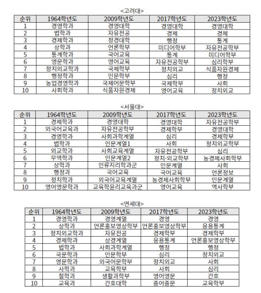 입시업체 진학사는 1964학년도부터 2023년학년도까지 고려대·서울대·연세대의 학과별 합격 점수를 통해 인기학과를 분석했다고 4일 밝혔다.