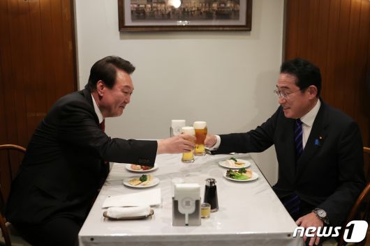 윤석열 대통령과 기시다 후미오 일본 총리가 16일 도쿄 긴자의 한 오므라이스 노포에서 친교를 나누며 맥주로 건배하고 있다. (대통령실 제공) 2023.3.17/뉴스1 ⓒ News1 오대일 기자 |