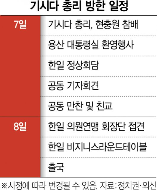 과거사 문제로 2011년부터 멈췄던 양국의 셔틀외교는 올 3월 윤 대통령이 강제징용 문제와 관련해 ‘제3자 변제’ 해법을 들고 방일하면서 재개됐다. 전날 정상회담 의제 조율을 위해 방한한 아키바 다케오 일본 국가안전보장국장은 윤 대통령을 만나 “윤 대통령의 한일 관계 개선 결단에 보답하기 위해 답방을 결심하게 됐다”는 기시다 총리의 메시지를 전했다. 이 때문에 기시다 총리가 과거사 문제에 대한 성의를 보이기 위해 2011년 10월 노다 요시히코 총리 이후 12년 만에 순국선열이 있는 국립현충원을 참배할 수 있다는 관측도 나온다. 대통령실은 기시다 총리의 현충원 참배와 관련해 “일정과 의제는 조율 중”이라며 말을 아꼈다. 기시다 총리는 방한 둘째 날인 8일에는 한일의원연맹 회장단과 만나고 전국경제인연합회·게이단렌과 함께 한일 경제인이 참여하는 비즈니스 라운드테이블에 참석할 예정이다.