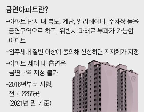 금연 아파트에서 왜 이런 일이 벌어질까. 금연 아파트는 주민 절반 이상이 동의하면 각 지자체가 아파트 복도, 계단, 엘리베이터, 주차장 등을 금연 구역으로 지정하고 이를 위반하면 5만~10만원의 과태료를 부과한다.