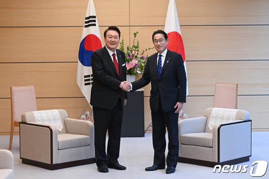 윤석열 대통령과 기시다 후미오 일본 총리가 지난 3월16일 도쿄 총리 관저에서 열린 소인수 정상회담에서 악수하고 있다. (대통령실 제공) 2023.3.19/뉴스1 ⓒ News1 안은나 기자 |