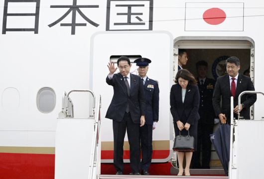 기시다 후미오 일본 총리가 1박2일간의 한국 방문을 위해 7일 오전 하네다 공항에 도착, 환송객들에게 인사하고 있다. 연합뉴스 |