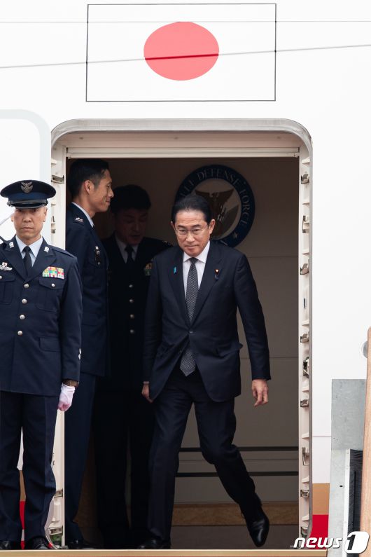 (성남=뉴스1) 유승관 기자 = 기시다 후미오(岸田文雄) 일본 총리가 7일 경기 성남시 서울공항에 도착해 트랩을 내려오고 있다. 기시다 총리는 도착 직후 국립현충원을 방문한 뒤 용산 대통령실에서 윤석열 대통령과 한일 정상회담에 임할 계획이다. 일본 총리가 양자 정상회담을 위해 우리나라를 찾는 건 지난 2011년 10월 노다 요시히코(野田佳彦) 당시 총리 이후 이번이 12년 만이다. 2023.5.7/뉴스1