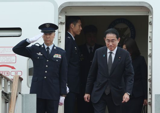 한일 정상회담을 위해 방한한 기시다 후미오 일본 총리와 기시다 유코 여사가 7일 성남 서울공항에 도착, 전용기에서 내리고 있다. <연합뉴스>