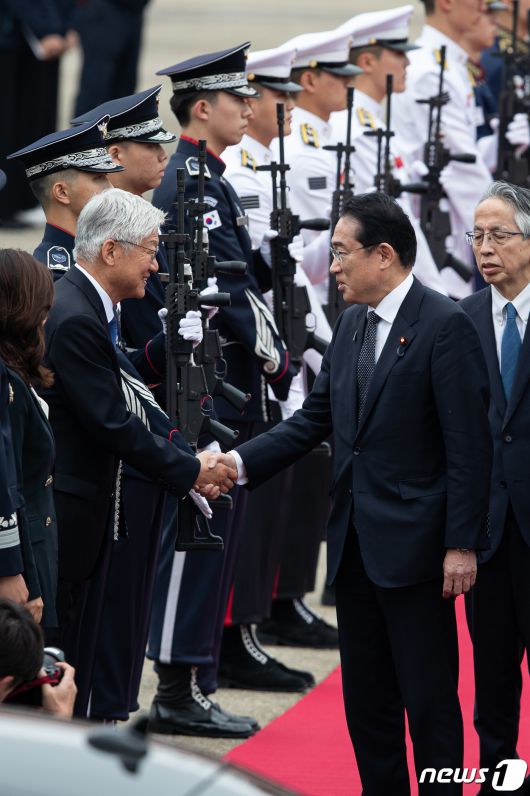 (성남=뉴스1) 유승관 기자 = 기시다 후미오(岸田文雄) 일본 총리가 7일 경기 성남시 서울공항에 도착해 환영인사들과 인사를 나누고 있다. 기시다 총리는 도착 직후 국립현충원을 방문한 뒤 용산 대통령실에서 윤석열 대통령과 한일 정상회담에 임할 계획이다. 일본 총리가 양자 정상회담을 위해 우리나라를 찾는 건 지난 2011년 10월 노다 요시히코(野田佳彦) 당시 총리 이후 이번이 12년 만이다. 2023.5.7/뉴스1