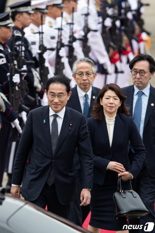 (성남=뉴스1) 유승관 기자 = 기시다 후미오(岸田文雄) 일본 총리 내외가 7일 경기 성남시 서울공항에 도착해 이동하고 있다. 기시다 총리는 도착 직후 국립현충원을 방문한 뒤 용산 대통령실에서 윤석열 대통령과 한일 정상회담에 임할 계획이다. 일본 총리가 양자 정상회담을 위해 우리나라를 찾는 건 지난 2011년 10월 노다 요시히코(野田佳彦) 당시 총리 이후 이번이 12년 만이다. 2023.5.7/뉴스1