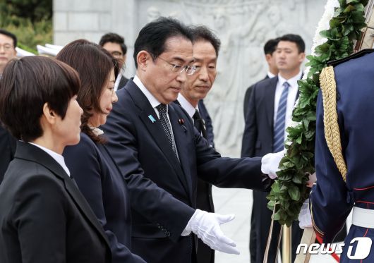 (서울=뉴스1) 사진공동취재단 = 기시다 후미오(岸田文雄) 일본 총리가 7일 방한 첫 일정으로 서울 동작구 국립서울현충원을 참배하며 헌화하고 있다. 2023.5.7/뉴스1