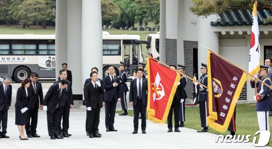 (서울=뉴스1) 사진공동취재단 = 기시다 후미오(岸田文雄) 일본 총리가 7일 방한 첫 일정으로 서울 동작구 국립서울현충원을 참배하며 국기에 대한 경례를 하고 있다. 2023.5.7/뉴스1kkorazi@news1.krCopyright ⓒ 뉴스1. All rights reserved. 무단 전재 및 재배포 금지.