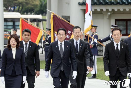 (서울=뉴스1) 사진공동취재단 = 기시다 후미오(岸田文雄) 일본 총리와 부인 기시다 유코 여사가 7일 방한 첫 일정으로 서울 동작구 국립서울현충원을 참배하고 있다. 2023.5.7/뉴스1