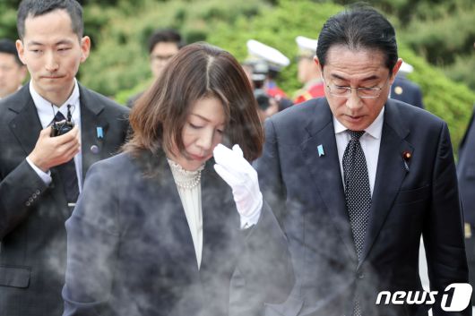 (서울=뉴스1) 사진공동취재단 = 기시다 후미오(岸田文雄) 일본 총리와 부인 기시다 유코 여사가 7일 방한 첫 일정으로 서울 동작구 국립서울현충원을 참배하고 있다. 2023.5.7/뉴스1