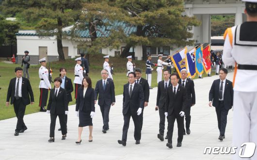 (서울=뉴스1) 사진공동취재단 = 기시다 후미오(岸田文雄) 일본 총리와 부인 기시다 유코 여사가 7일 방한 첫 일정으로 서울 동작구 국립서울현충원을 참배하고 있다. 2023.5.7/뉴스1