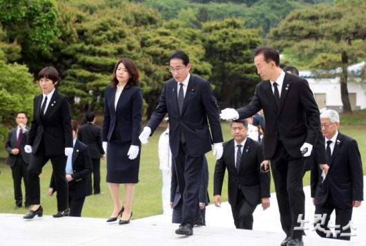 7일 오후 서울 동작구 국립서울현충원에서 방한 일정을 시작한 기시다 후미오(오른쪽 둘째부터) 일본 총리와 기시다 유코 여사 참배를 위해 이동하고 있다. 1박 2일 일정으로 한국을 찾은 기시다 총리는 지난 3월 일본에서 열린 한일 정상회담 이후 50여 일 만에 서울에서 윤석열 대통령을 다시 만나 회담을 갖는다.