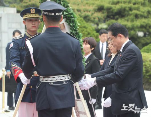 7일 오후 서울 동작구 국립서울현충원에서 방한 일정을 시작한 기시다 후미오 일본 총리와 기시다 유코(오른쪽 둘째) 여사가 헌화를 하고 있다 . 1박 2일 일정으로 한국을 찾은 기시다 총리는 지난 3월 일본에서 열린 한일 정상회담 이후 50여 일 만에 서울에서 윤석열 대통령을 다시 만나 회담을 갖는다.
