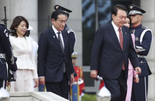 윤석열 대통령과 기시다 후미오 일본 총리가 7일 서울 용산 대통령실 청사에서 열린 공식환영식에서 의장대 사열을 위해 이동하고 있다. (사진=뉴시스) |