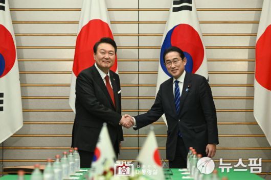 윤석열 대통령과 기시다 후미오 일본 총리가 지난 3월 16일 도쿄 총리 관저에서 한일 정상회담을 하면서 악수하고 있다. [사진=대통령실] |