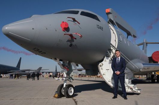2021년 두바이 에어쇼에 참석한 카짐 레드조빅 사브(SAAB) 감시정찰사업본부 이사가 자사 공중조기경보통제기인 '글로벌아이' 앞에서 기념촬영을 하고 있다. [사진 사브] |