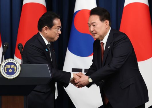 악수하는 한일 정상 - 윤석열 대통령과 한국을 찾은 기시다 후미오 일본 총리가 7일 서울 용산 대통령실 청사에서 공동 기자회견에서 양국 발표를 마친 뒤 악수하고 있다. 2023.5.7 연합뉴스 |