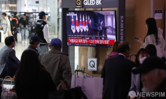 [서울=뉴스핌] 김학선 기자 = 윤석열 대통령과 기시다 후미오 일본 총리의 한일정상회담이 열린 7일 오후 서울역 대합실에서 시민들이 한일 정상 공동기자회견을 시청하고 있다. 2023.05.07 yooksa@newspim.com 저작권자(c) 글로벌리더의 지름길 종합뉴스통신사 뉴스핌(Newspim), 무단 전재-재배포 금지