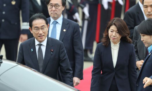 한일 정상회담을 위해 방한한 기시다 후미오 일본 총리와 기시다 유코 여사가 7일 성남 서울공항에 도착, 차량 탑승을 위해 이동하고 있다. 연합뉴스 |