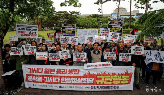정의기억연대와 민족문제연구소 등으로 구성된 한일역사평화행동 회원 50여 명(경찰 추산)은 이날 오후 2시 서울 용산 대통령실 인근 전쟁기념관 정문에서 한일 정상회담 규탄시위를 진행했다. 집회 참석자들은 플래카드를 들고 “일본 정부는 불법 식민지배를 사죄하라” “한일 군사정보보호협정(GSOMIA·지소미아)을 폐기하라” 등의 구호를 외쳤다. 또 강제동원에 대한 일본 정부의 사죄 및 배상과 후쿠시마 원전 오염수 방류 결정 철회 등을 주장했다.