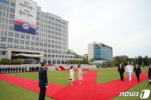 (서울=뉴스1) 오대일 기자 = 윤석열 대통령과 기시다 후미오 일본 총리가 7일 서울 용산 대통령실 청사 잔디마당에서 열린 공식 환영식에서 의장대를 사열하고 있다. (대통령실 제공) 2023.5.7/뉴스1kkorazi@news1.krCopyright ⓒ 뉴스1. All rights reserved. 무단 전재 및 재배포 금지.
