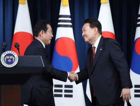 [서울=뉴시스] 전신 기자 = 윤석열 대통령과 기시다 후미오 일본 총리가 7일 서울 용산 대통령실 청사에서 열린 공동기자회견을 마친 뒤 악수하고 있다. 2023.05.07. |