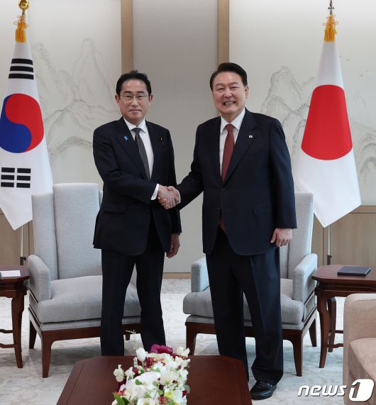 (서울=뉴스1) 오대일 기자 = 윤석열 대통령과 기시다 후미오 일본 총리가 7일 서울 용산 대통령실 청사에서 열린 소인수 회담에서 기념촬영을 하고 있다. (대통령실 제공) 2023.5.7/뉴스1
