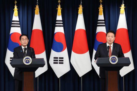 기시다 후미오 일본 총리가 7일 서울 용산 대통령실에서 열린 공동 기자회견에서 한일 과거사 문제와 일본 후쿠시마 원전 오염수 방류 문제에 대해 전향적인 입장을 내놓았다. 윤석열 대통령이 3월 한일 관계 정상화를 위해 제시한 제3자 변제 방식의 해법은 국내에서 부정적인 여론이 여전하고 후쿠시마 원전 오염수 방류 문제도 거부감이 크다. 하지만 기시다 총리는 이 문제에 대해 일본 내각을 대표하는 자신의 입장을 분명히 밝히면서 설득에 나섰다.