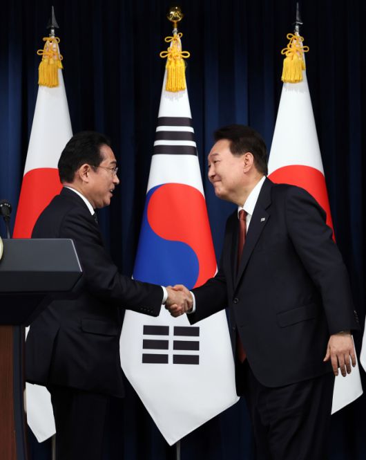 특히 기시다 총리는 한일 관계 개선을 위한 핵심 명제인 과거사 문제에 대해서도 진전된 입장을 밝혔다. 기시다 총리는 이날 한국 측이 발표한 강제징용 해법을 언급하며 “3월에 윤 대통령께서 나타내신 (강제징용 해법에 대한) 결단과 행동력에 다시 한 번 경의 표하려 한다”며 “일한(한일) 관계 강화를 원하는 강한 마음을 저도 공유하고 있다”고 강조했다.