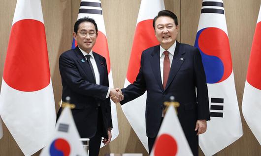 윤 대통령은 이날 용산 대통령실에서 열린 기시다 후미오(岸田文雄) 일본 총리와의 정상회담 공동기자 회견에서 워싱턴 선언이 한·미·일 간 협력으로 확대될 수 있느냐는 질문에 “양국이 북핵 위협에 함께 노출돼 있어 안보 협력이 그 어느 때보다 중요하다”며 이같이 밝혔다.