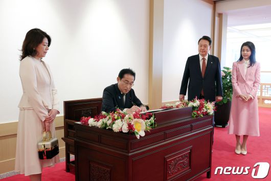(서울=뉴스1) 오대일 기자 = 윤석열 대통령이 7일 용산 대통령실 청사에서 열린 한일 정상회담에 앞서 기시다 후미오 일본 총리의 방명록 작성을 지켜보고 있다. (대통령실 제공) 2023.5.7/뉴스1
