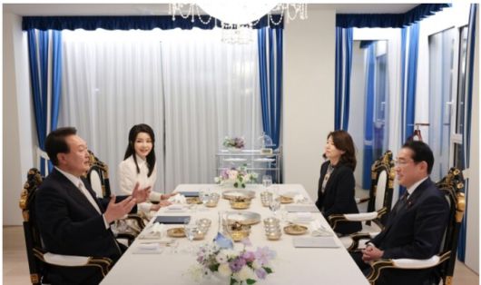 윤 대통령과 부인 김건희 여사는 이날 오후 7시30분부터 한남동 관저로 기시다 총리 부부를 초청해 약 2시간 동안 만찬을 함께했다고 김은혜 홍보수석이 서면 브리핑으로 전했다.