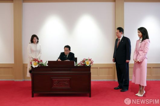 [서울=뉴스핌] 윤석열 대통령이 7일 용산 대통령실 청사에서 기시다 후미오 일본 총리의 방명록 작성을 바라보고 있다. [사진=대통령실] 2023.05.07 photo@newspim.com 저작권자(c) 글로벌리더의 지름길 종합뉴스통신사 뉴스핌(Newspim), 무단 전재-재배포 금지