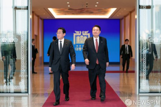 [서울=뉴스핌] 윤석열 대통령과 기시다 후미오 일본 총리가 7일 용산 대통령실 청사에서 열린 공동 기자회견을 마친 뒤 이동하고 있다. [사진=대통령실] 2023.05.07 photo@newspim.com 저작권자(c) 글로벌리더의 지름길 종합뉴스통신사 뉴스핌(Newspim), 무단 전재-재배포 금지