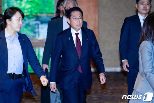 (서울=뉴스1) 안은나 기자 = 기시다 후미오 일본 총리가 8일 오전 서울 중구 롯데호텔에서 정진석 한일의원연맹 회장, 윤호중 간사장을 면담하기 위해 이동하고 있다. 2023.5.8/뉴스1