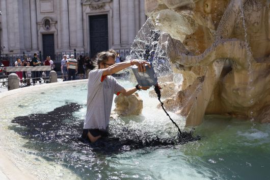 지난 6일(현지시각) 이탈리아 환경단체 ‘마지막 세대’(울티마 제네라치오네)의 활동가가 로마 피우미 분수에 들어가 검은색 먹물을 붓고 있다./AP연합뉴스 |