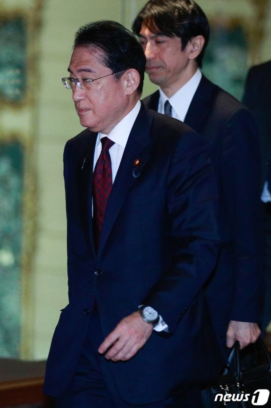 (서울=뉴스1) 안은나 기자 = 기시다 후미오 일본 총리가 8일 오전 서울 중구 롯데호텔에서 한일의원연맹 면담·경제6단체장 간담회를 마친 후 귀국 준비를 위해 이동하고 있다. 2023.5.8/뉴스1