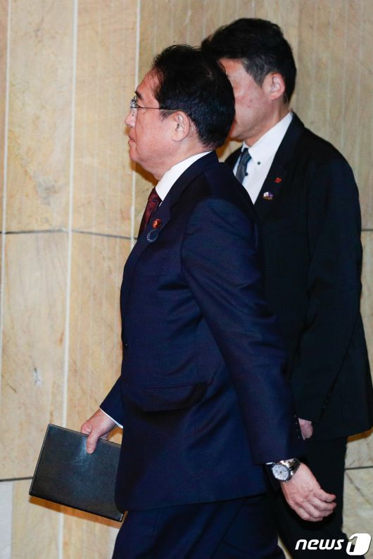 (서울=뉴스1) 안은나 기자 = 기시다 후미오 일본 총리가 8일 오전 서울 중구 롯데호텔에서 한일의원연맹 면담·경제6단체장 간담회를 마친 후 귀국 준비를 위해 이동하고 있다. 2023.5.8/뉴스1