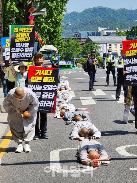 [이데일리 황병서 기자] 한·일 정상이 ‘후쿠시마 오염수 방류 시찰단 파견’에 합의한 가운데 원전 오염수 방류 중단을 촉구하는 목소리가 국내에서 이어지고 있다. 대한불교조계종 사회노동위원회(사노위) 스님들은 일본의 후쿠시마 방사능 오염수 방류 중단을 촉구하며 오체투지 행진에 나섰다.