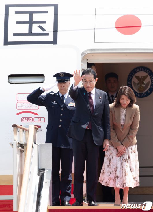 (성남=뉴스1) 이재명 기자 = 기시다 후미오 일본 총리가 8일 경기도 성남시 서울공항에서 출국하기 전 인사하고 있다. 2023.5.8/뉴스1