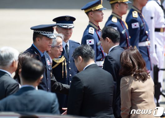 (성남=뉴스1) 이재명 기자 = 기시다 후미오 일본 총리가 8일 경기도 성남시 서울공항에서 출국하기 전 아이보시 고이치 주한 일본대사 등과 인사를 나누고 있다. 2023.5.8/뉴스12expulsion@news1.krCopyright ⓒ 뉴스1. All rights reserved. 무단 전재 및 재배포 금지.