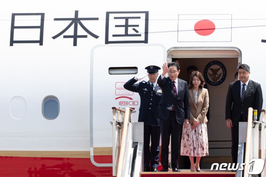 (성남=뉴스1) 이재명 기자 = 기시다 후미오 일본 총리가 8일 경기도 성남시 서울공항에서 출국하기 전 인사하고 있다. 2023.5.8/뉴스1