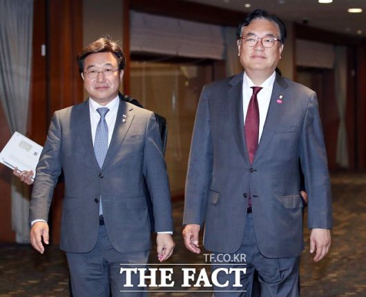 한일의원연맹 회장인 국민의힘 정진석(오른쪽) 의원, 간사장인 더불어민주당 윤호중 의원이 8일 서울의 한 호텔에서 기시다 후미오 일본 총리와의 면담을 마친 후 이동하고 있다. /뉴시스 |