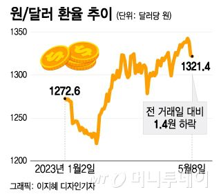 8일 서울 외환시장에서 원/달러 환율은 전 거래일보다 1.4원 내린 1321.4원에 거래를 마쳤다. 3거래일 연속 하락세다.