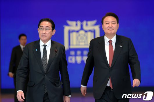 윤석열 대통령과 기시다 후미오 일본 총리가 7일 용산 대통령실 청사에서 열린 공동 기자회견을 마친 후 나란히 이동하고 있다. (대통령실 제공) 2023.5.7/뉴스1 ⓒ News1 오대일 기자 |