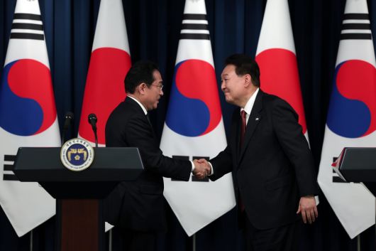 윤석열 대통령과 기시다 후미오 일본 총리가 7일 용산 대통령실 청사에서 열린 공동 기자회견에서 악수하고 있다. 대통령실 |